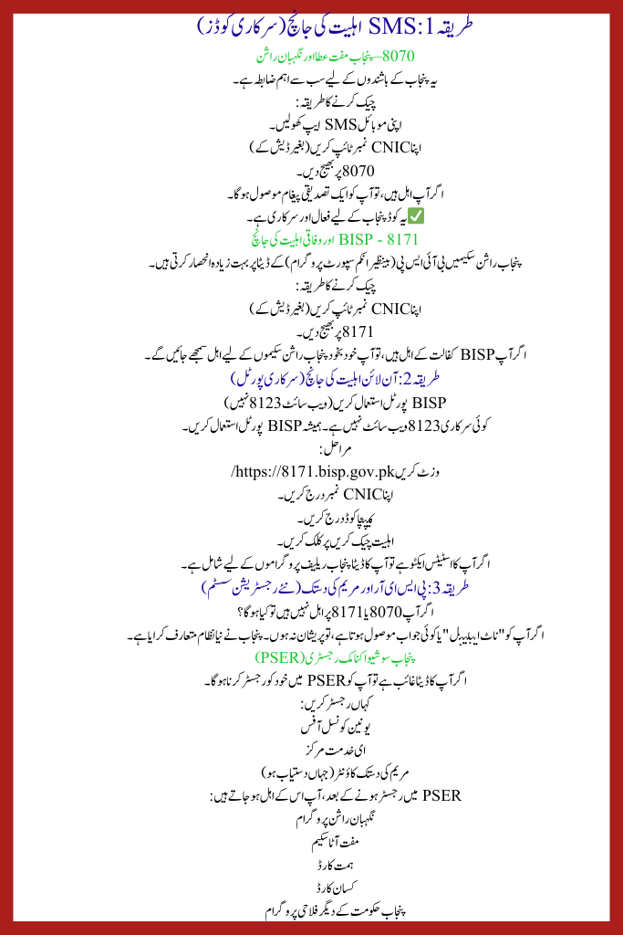 The 8123 Rashan Code Update 2025–2026. The Punjab Government has replaced old systems with 8070, 8171, and PSER registration under the Nigehban Rashan Program (Maryam Nawaz Scheme).