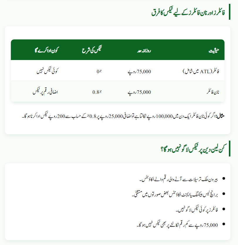 This means if a non-filer withdraws more than Rs. 75,000 in one day, tax will be charged on the amount exceeding that limit. Meanwhile, taxpayers listed in the Active Taxpayers List (ATL) remain exempt from this tax.