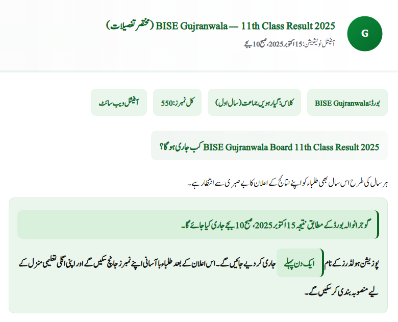 As per the official board notification, the BISE Gujranwala Board 11th Class Result 2025 will be declared on Wednesday, October 15, 2025, at 10:00 AM. The names of top position holders will be announced one day before the main result. Once released, students can easily check their marks online, by SMS, or by downloading the official gazette.