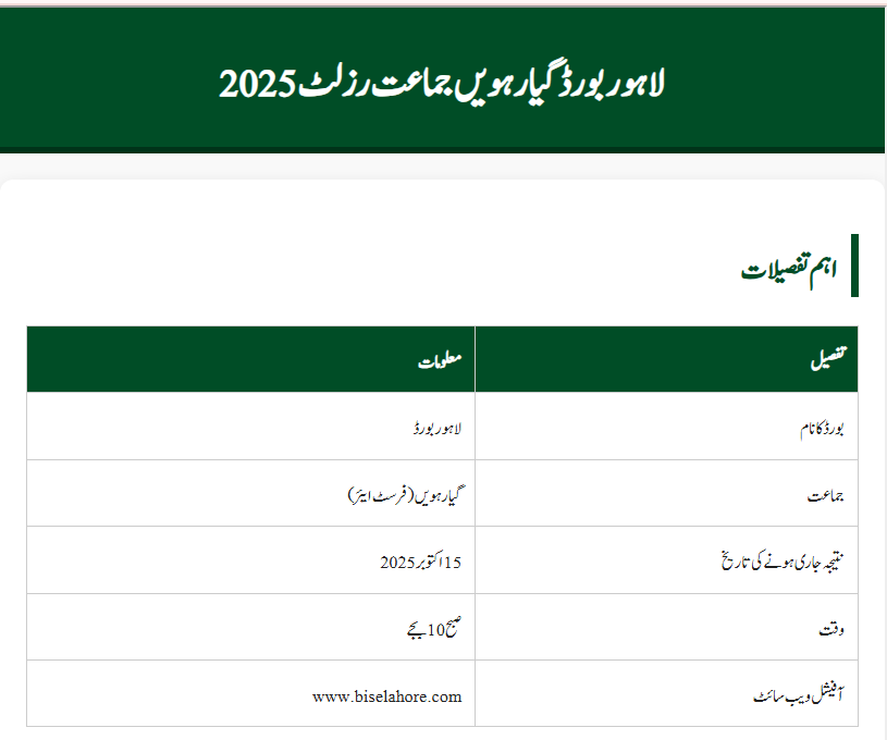 The first and most important question in every student’s mind is the date of the result. The Lahore Board has officially announced that the BISE Lahore 11th Class Result 2025 will be declared on Wednesday, October 15, 2025, at 10:00 AM. On this day, thousands of students and parents will check the results online or via SMS. This will be a memorable moment for all the hardworking students who dedicated months to their studies and exams.