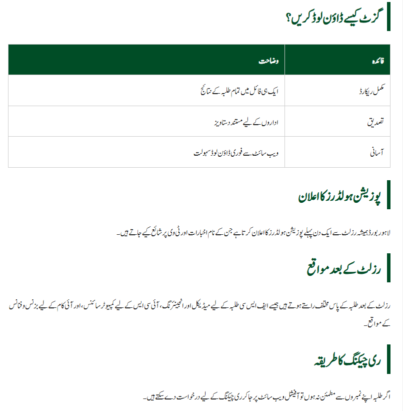 The gazette has always been a reliable source for results. On the result day, the Lahore Board uploads the PDF gazette file on its official website. This file contains the results of all students at once. Schools, colleges, and institutions download it for record-keeping and verification. Students can also use the gazette to double-check their results.