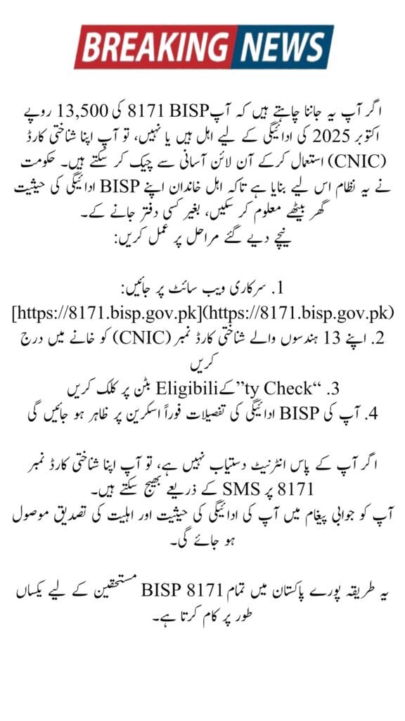 To confirm if you are eligible for the BISP 8171 Rs. 13,500 October 2025 payment, you can easily check online using your CNIC number. The government has made this system easy so that families can check their BISP payment status without visiting offices.