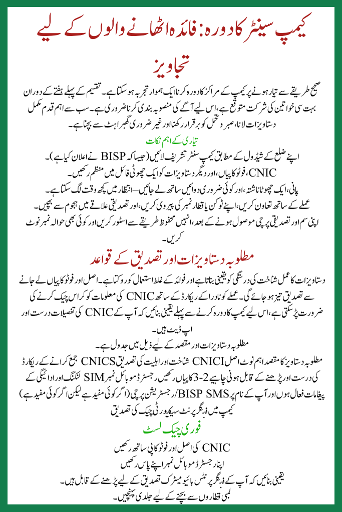 Women belonging to the accepted districts must call only their designated camps for account inaugural and SIM collection. This targeted approach allows BISP to manage the process easily and verify each account through biometric systems. It also ensures beneficiaries do not face unnecessary travel or pressure.