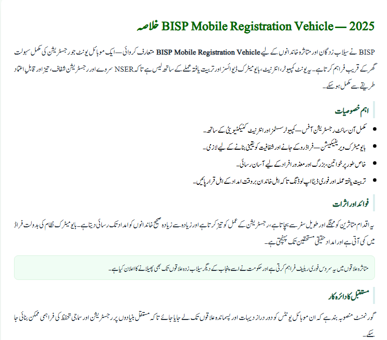 The BISP Mobile Registration Vehicle for Flood Victims is more than a temporary solution—it is a lifeline for flood-affected families. By bringing services directly to villages, the government has made registration easier, faster, and fairer.