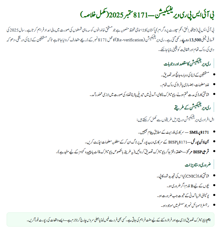 The BISP Re-Verification 8171 September 2025 is a very important step for all beneficiaries. If you are already getting money from BISP, do not ignore this re-check. Make sure your CNIC is valid, your details are updated, and you reply to messages from 8171.