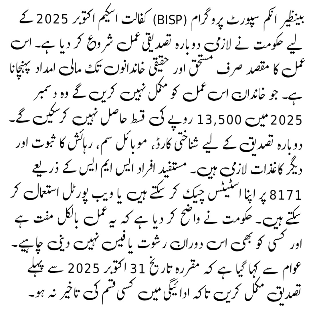 BISP Kafalat October 2025 payment re-verification has officially started, and thousands of families across Pakistan are being asked to confirm their eligibility again. This is a top news update for millions of poor households relying on the Benazir Income Support Program (BISP). The government has made it clear: only those who complete re-verification will receive the upcoming Rs. 13,500 installment in December 2025.