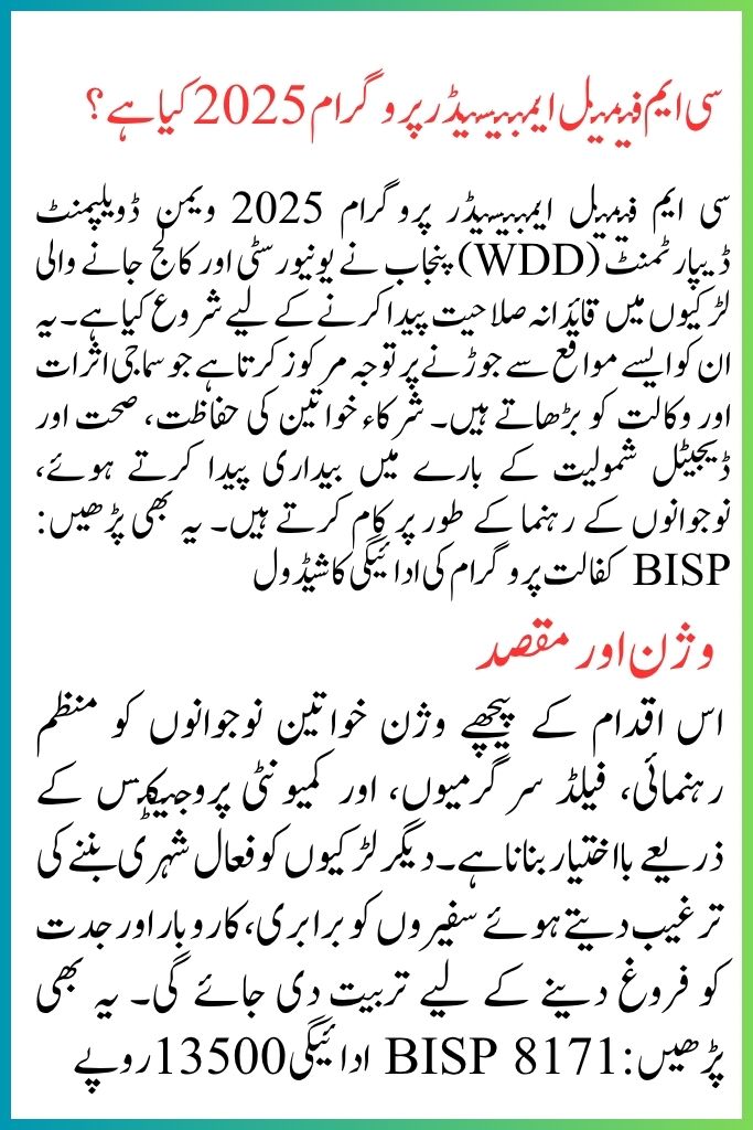 The CM Female Ambassador Program 2025 is launched by the Women Development Department (WDD) Punjab to build leadership capacity among university and college-going girls. It focuses on connecting them with opportunities that enhance social impact and advocacy. Participants act as youth leaders, raising awareness on women’s safety, health, and digital inclusion. Also Read: BISP Kafalat Program Payment Schedule