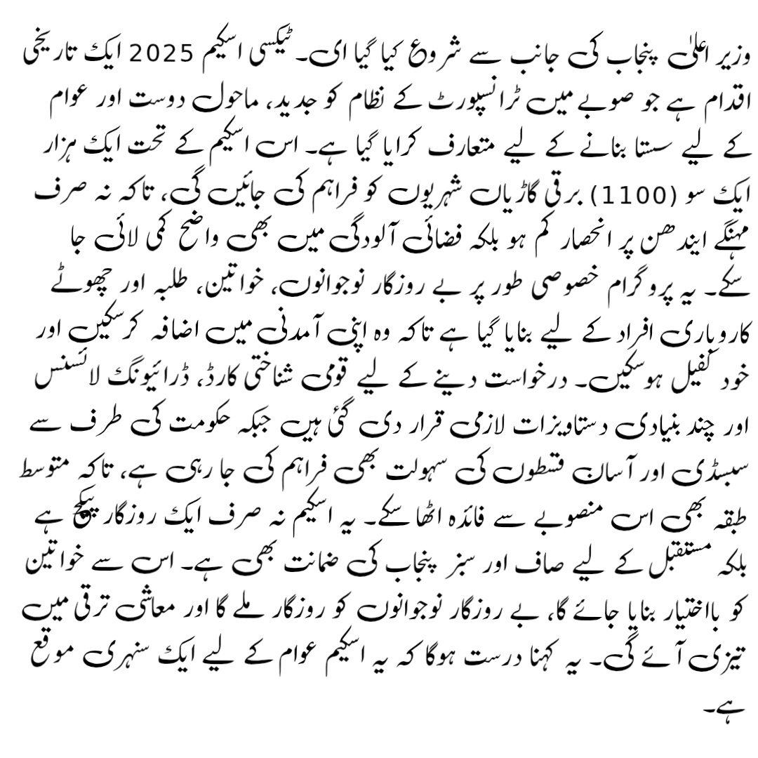 The scheme is open to Punjab citizens with a valid CNIC. Special consideration is given to women, students, and unemployed youth. Applicants must also hold a valid driving license if applying as a taxi driver.