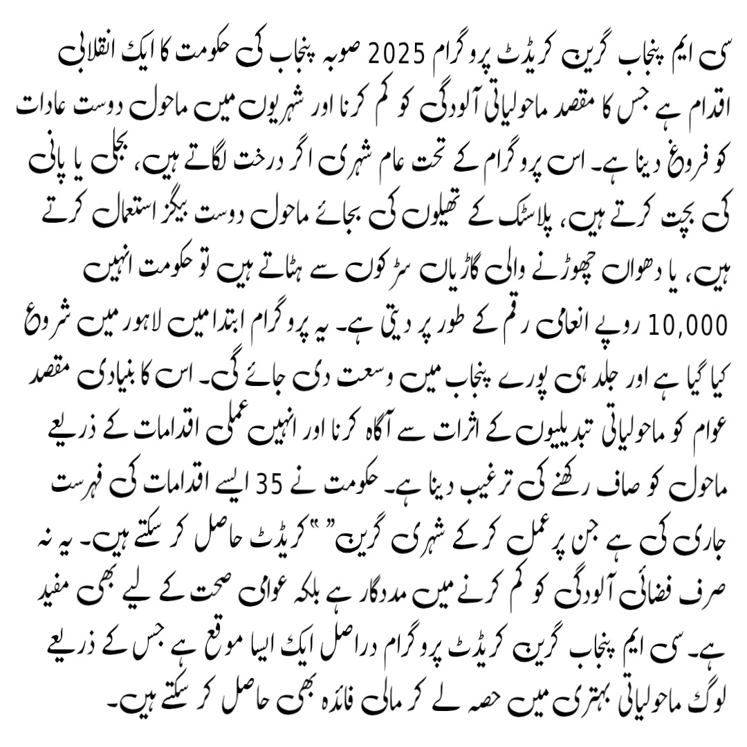 The CM Punjab Green Credit Program 2025 is a brilliant step toward a cleaner and greener Punjab. By participating, you not only help protect the environment but also earn financial benefits. If you live in Lahore, take the first step today — your actions can make a big difference for the future. 👉 Read More