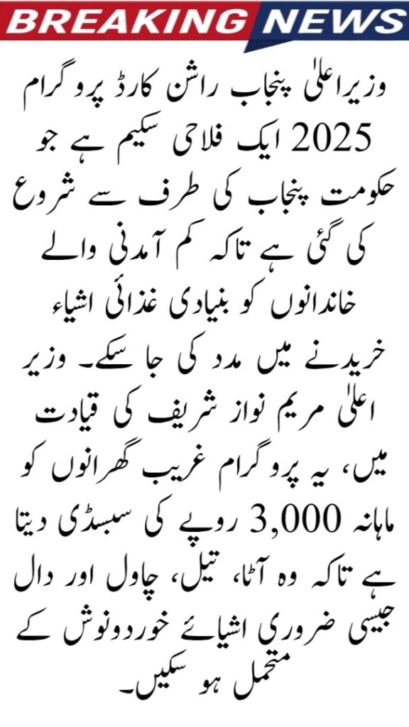 The CM Punjab Ration Card Program 2025 is a welfare scheme launched by the Government of Punjab to help low-income families buy basic food items. Under the leadership of Chief Minister Maryam Nawaz Sharif, this program gives a monthly subsidy of Rs 3,000 to poor households so they can afford essential groceries like flour, oil, rice, and pulses.