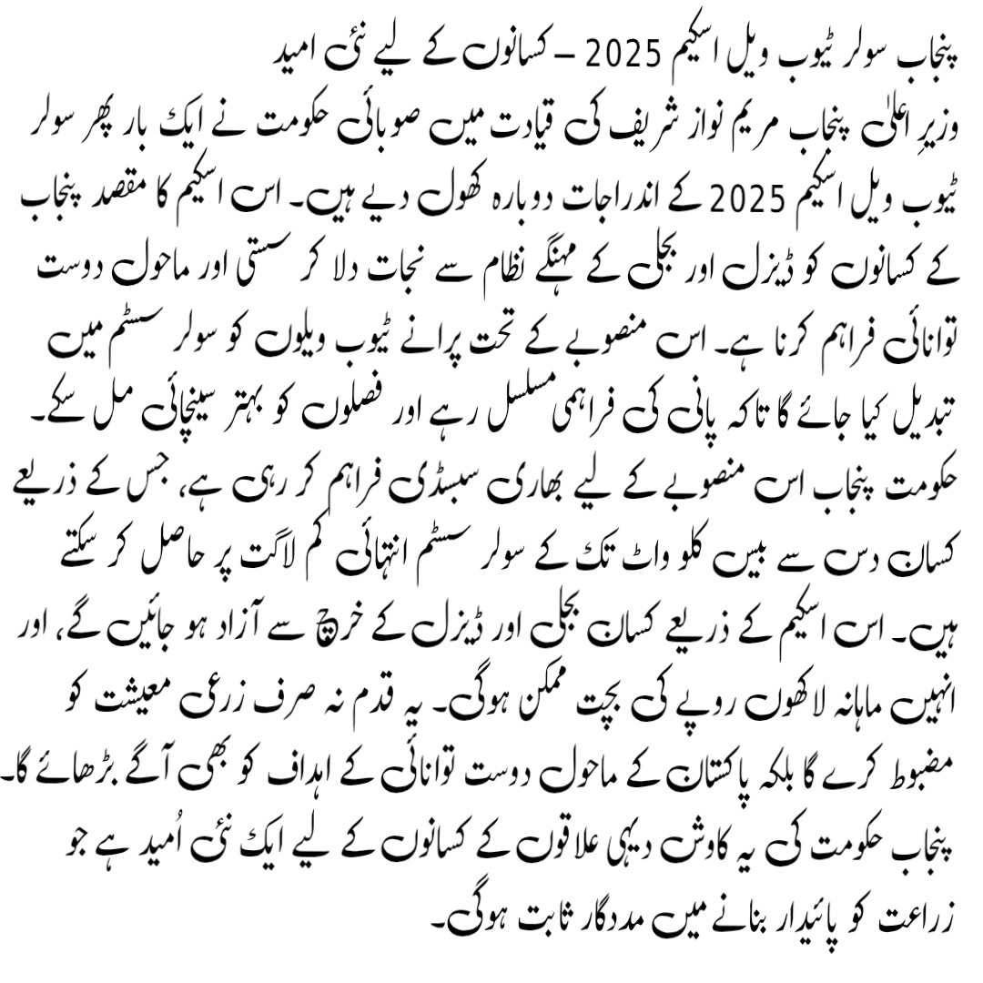 The Punjab Government has once again opened registrations for the CM Punjab Solar Tubewell Scheme 2025, a major step led by Chief Minister Maryam Nawaz Sharif to empower farmers with solar-powered irrigation systems. This program aims to replace diesel and electric tube wells with clean solar energy—cutting irrigation costs and ensuring a reliable water supply all year round.