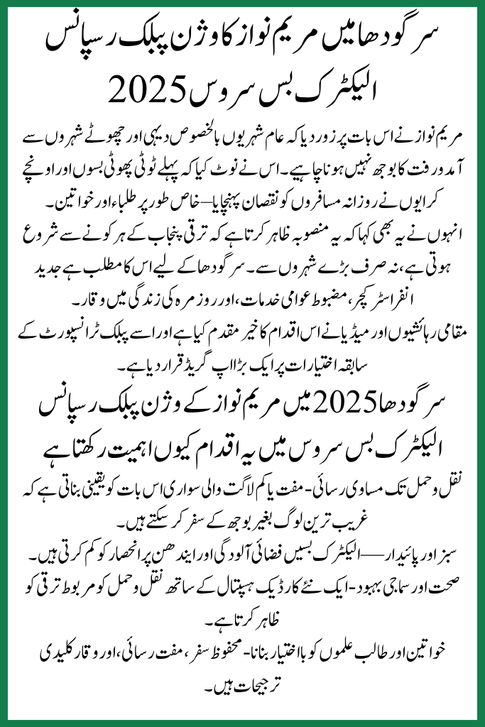 Why This Initiative Matters in Maryam Nawaz’s Vision Public Response Electric Bus Service in Sargodha 2025