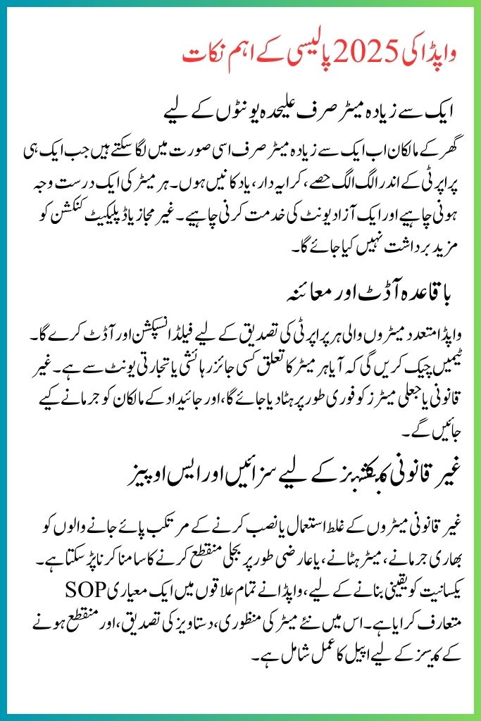 WAPDA will conduct field inspections and audits to verify every property with multiple meters. Teams will check if each meter belongs to a legitimate residential or commercial unit. Illegal or fake meters will be removed immediately, and fines will be issued to property owners.