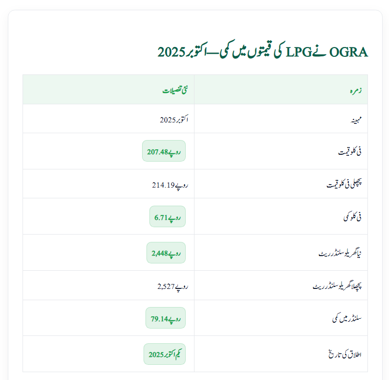 Pakistani households have been struggling under the weight of rising inflation, where fuel and energy costs make up a big part of monthly budgets. Any news of price reduction brings a sigh of relief for ordinary families. Recently, the LPG Prices for October were officially reduced, giving direct benefit to millions of consumers. Both the per kilogram rate and domestic cylinder cost have been cut down, bringing ease for households and small businesses. This decision marks the second consecutive month of relief, proving that OGRA is taking steps to reduce the financial burden on the public.