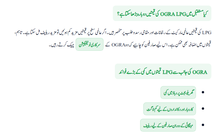 Experts say LPG prices depend on international oil and gas market trends as well as local supply and demand. If global crude prices fall further, consumers may see more relief in the coming months. However, if global energy costs rise, it will likely impact Pakistan’s LPG Prices as well. This is why consumers should regularly check OGRA’s official notifications for updated rates.