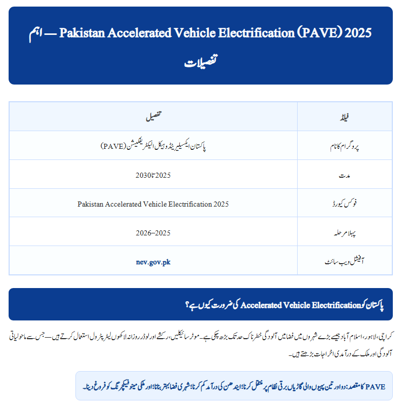 Rising fuel prices, heavy pollution, and economic pressure have made daily life difficult for Pakistanis. To solve these problems, the Government of Pakistan has launched a groundbreaking program — (PAVE) 2025.