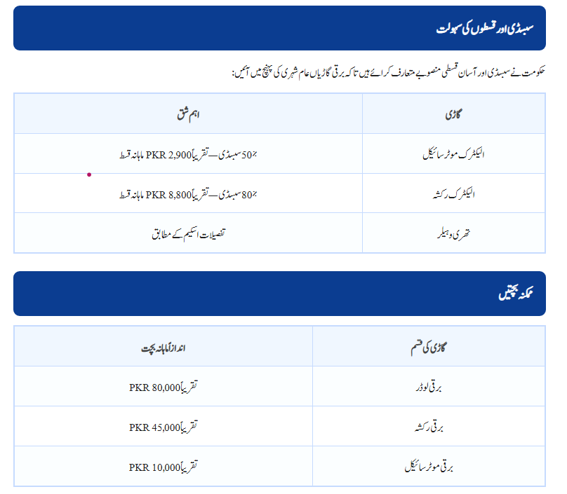 • Electric Rickshaw: 80% subsidy — approx. PKR 8,800/month