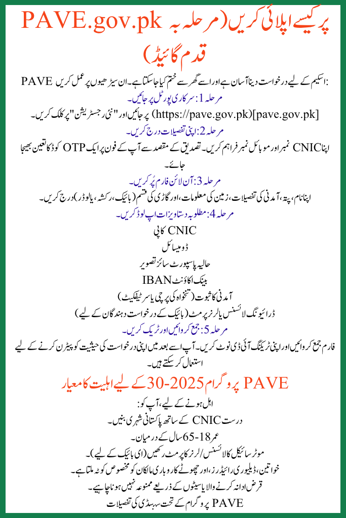 | PAVE – Pakistan Accelerated Vehicle Electrification Program 2025-26 | July 2025 | Ongoing (till quota filled) | Rs. 80,000 (E-bikes) – Rs. 400,000 (Rickshaws/Loaders) | Online (pave.gov.pk) |