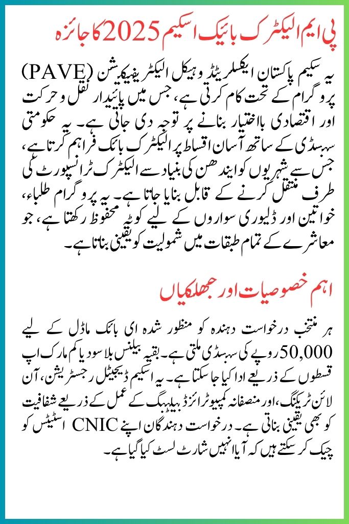 The scheme operates under the Pakistan Accelerated Vehicle Electrification (PAVE) Program, focusing on sustainable mobility and economic empowerment. It provides electric bikes on easy installments with a government subsidy, enabling citizens to shift from fuel-based to electric transport. The program reserves quotas for students, women, and delivery riders, ensuring inclusivity across all segments of society. Also Read: BISP Ehsaas Payment 2025 Guide (https://intergain.com.pk/bisp-ehsaas-payment-2025-guide-how-to-receive-money/)