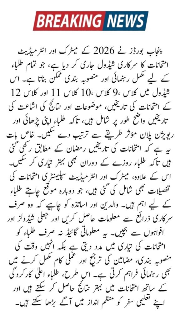 The Punjab Boards have officially announced the Matric (Class 9 & 10) and Intermediate (Class 11 & 12) exam schedule for 2026, providing clarity for millions of students across the province. The dates have been revised to accommodate Ramadan, ensuring students have enough preparation time and can perform well during exams. This schedule applies uniformly to all nine Punjab boards including Lahore, Rawalpindi, Faisalabad, Multan, Gujranwala, Sargodha, Bahawalpur, Dera Ghazi Khan, and Sahiwal. For official updates, students can visit the Punjab Boards official website.