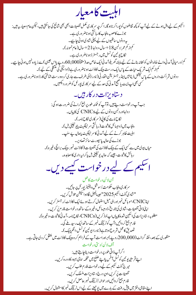 To qualify for the Punjab Marriage Gift Scheme 2025 you must meet certain requirements. While official full details may still be published, typical criteria are: