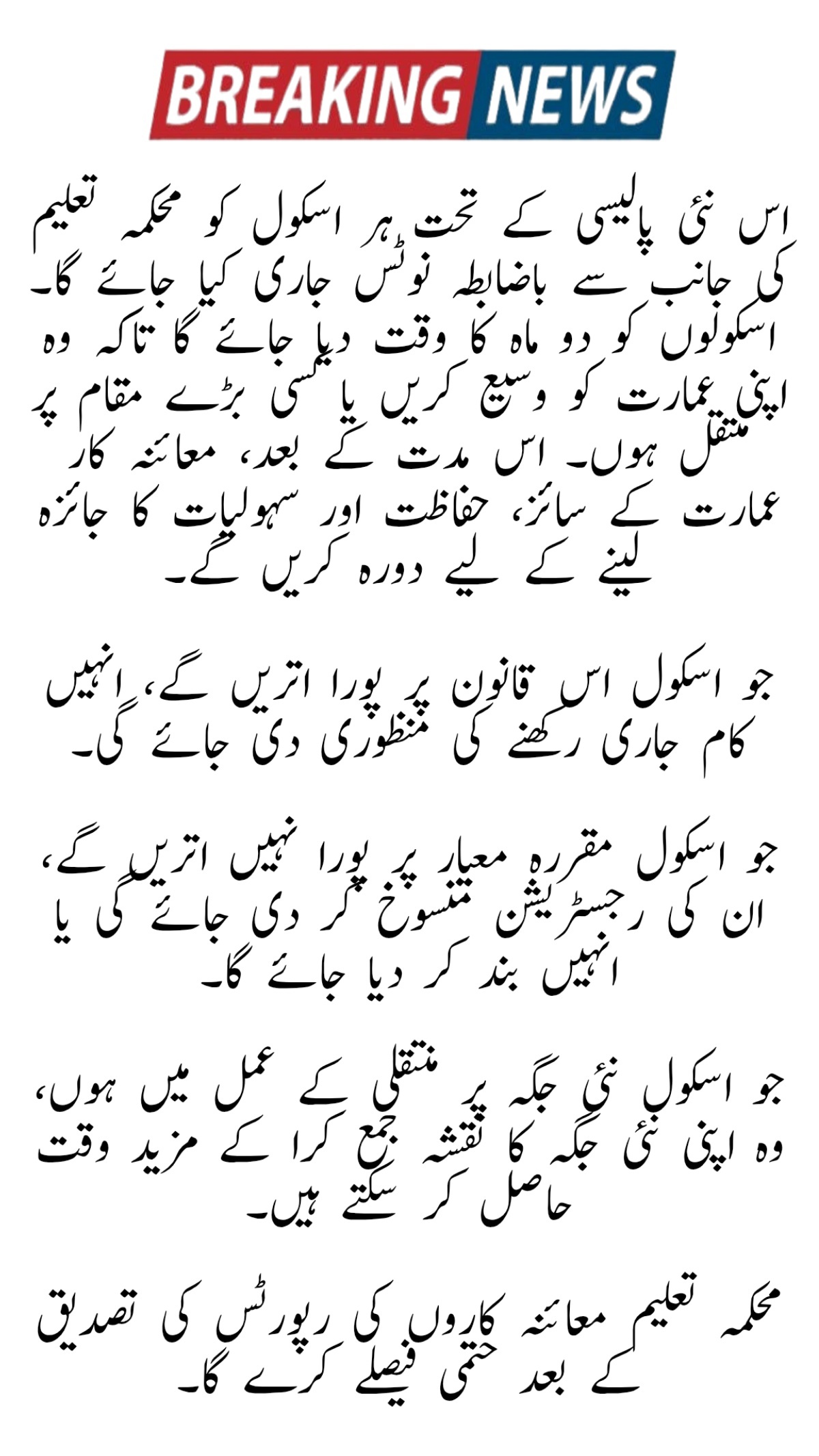Under this new policy, every school will get an official notice from the education department. They will have two months to expand or move to a bigger location. After that, inspectors will visit to check the building size, safety, and facilities.
