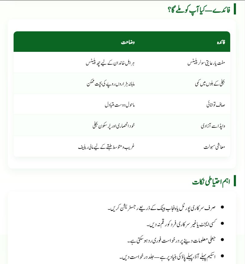 Under this scheme, each eligible household will receive six solar panels (plates) completely free of cost or through easy financing plans. This project targets low- and middle-income families whose monthly electricity consumption is 300 units or more. Launched under the leadership of Chief Minister Maryam Nawaz Sharif, the program aims to bring light and relief to every home, ensuring that affordable and clean energy is within everyone’s reach.