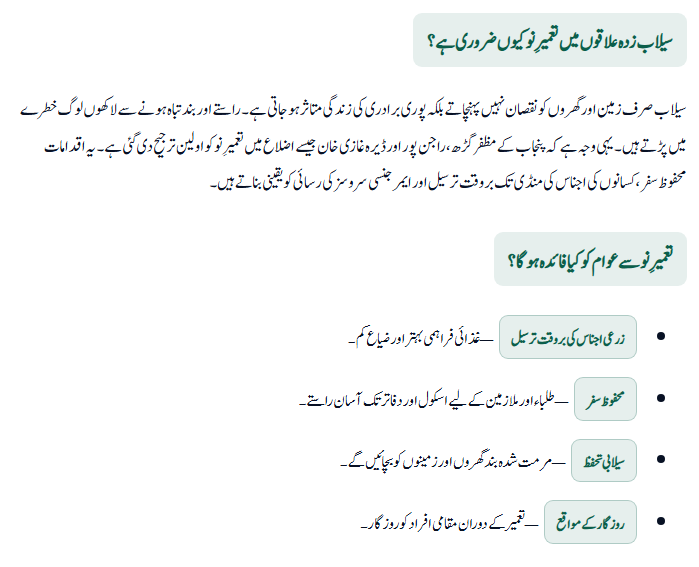 Floods do not just damage land and homes—they break the backbone of entire communities. Roads get washed away, bridges collapse, and protective embankments are weakened, leaving millions vulnerable. In Punjab, several districts including Muzaffargarh, Rajanpur, and DG Khan have suffered major losses in recent years. This is why reconstruction in flood-affected areas has been prioritized. Without rebuilding these essential routes and barriers, people cannot safely travel, farmers cannot transport their crops to markets, and emergency services remain unable to reach villages in time. By repairing these structures now, the government is not only addressing today’s damages but also reducing the risks for tomorrow.