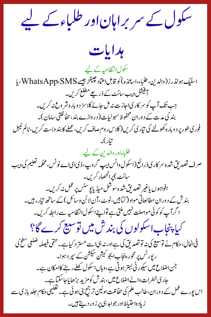 Though many schools reopened after short suspensions, Schools and Colleges Closure Expected Across Punjab may be extended depending on evolving conditions.