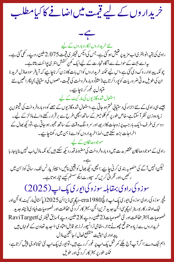 The Suzuki Ravi Discontinued in Pakistan 2025 and its concurrent price upsurge marks the end of an era in Pakistan’s light-commercial vehicle segment. For many dealers, delivery operators and small trades, the Ravi has remained a trusted workhorse — affordable, simple, reliable.